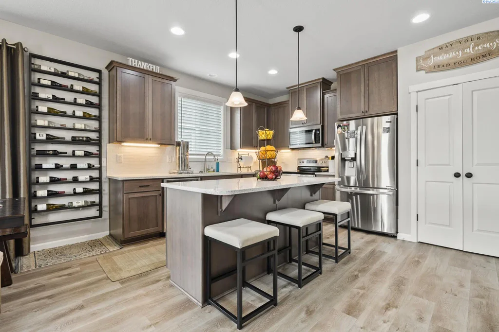 MLS# 287754 Step into style! MLS# 281421 shines with 9-foot ceilings and a one-of-a-kind, custom-built fireplace anchoring the great room. Fireplace was professionally redone in 2023—absolutely stunning! The smart split-bedroom layout offers 3 bedrooms + an office and 2 full baths, balancing privacy and togetherness.You’ll love entertaining in the spacious great room and dream kitchen featuring quartz countertops, stainless appliances, under-cabinet lighting, a large pantry, and a island with breakfast bar. Oversized windows and tall 9 foot ceilings make every space feel bright and airy. Durable, top-of-the-line laminate flooring runs through high-traffic areas, and custom blinds + curtains elevate the finish.Out back, the professionally landscaped yard sets the scene for easy outdoor living on the open patio. Plenty of storage and an attached 2-car garage complete the package.Shows like new, move-in ready, and full of wow—schedule your tour today!