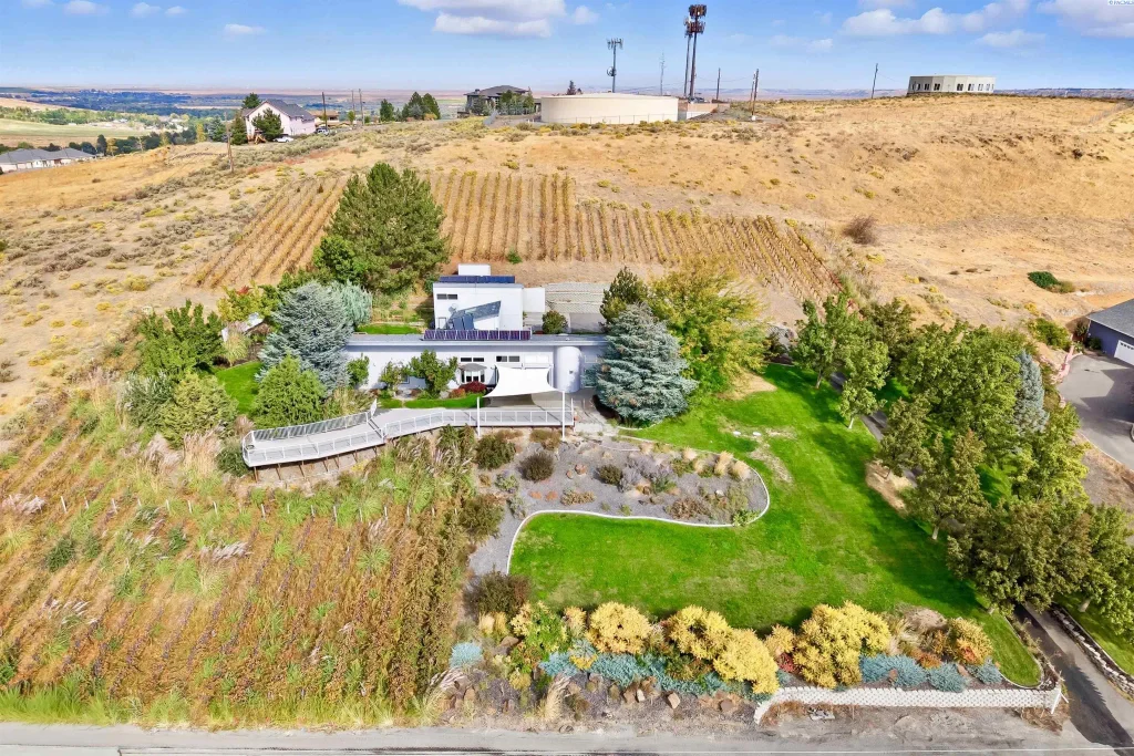 Welcome to one of West Richland’s most coveted lifestyle properties, where refined living meets the timeless beauty of wine country. Set on 2.5 acres with sweeping panoramic views, this 3,354 sq. ft. luxury rambler is more than a home, it’s a private retreat designed for those who value space, elegance, and connection to the land. Inside, you’ll find four bedrooms and three baths, including dual primary suites thoughtfully placed at opposite ends of the home, perfect for multi-generational living or long-term guests. The interiors are beautifully updated with Dansk engineered hardwood floors, designer paint, motorized blinds, and a full stainless steel appliance package featuring a 5-burner propane cooktop. The great room, anchored by a high-efficiency gas fireplace framed in custom brickwork, invites conversation and comfort with stunning views at every angle. Upstairs, a 500+ sq. ft. bonus space adds flexibility for an office, media room, or private lounge. Step outside and you’ll discover over 1,600 sq. ft. of wraparound decking, designed for entertaining, relaxing, or simply watching the sunset over the vineyards. This property even comes with its own established, producing vineyard—a rare opportunity to embrace the lifestyle that makes the Tri-Cities so unique. A solar installation provides yearly energy savings, making this estate as efficient as it is beautiful.